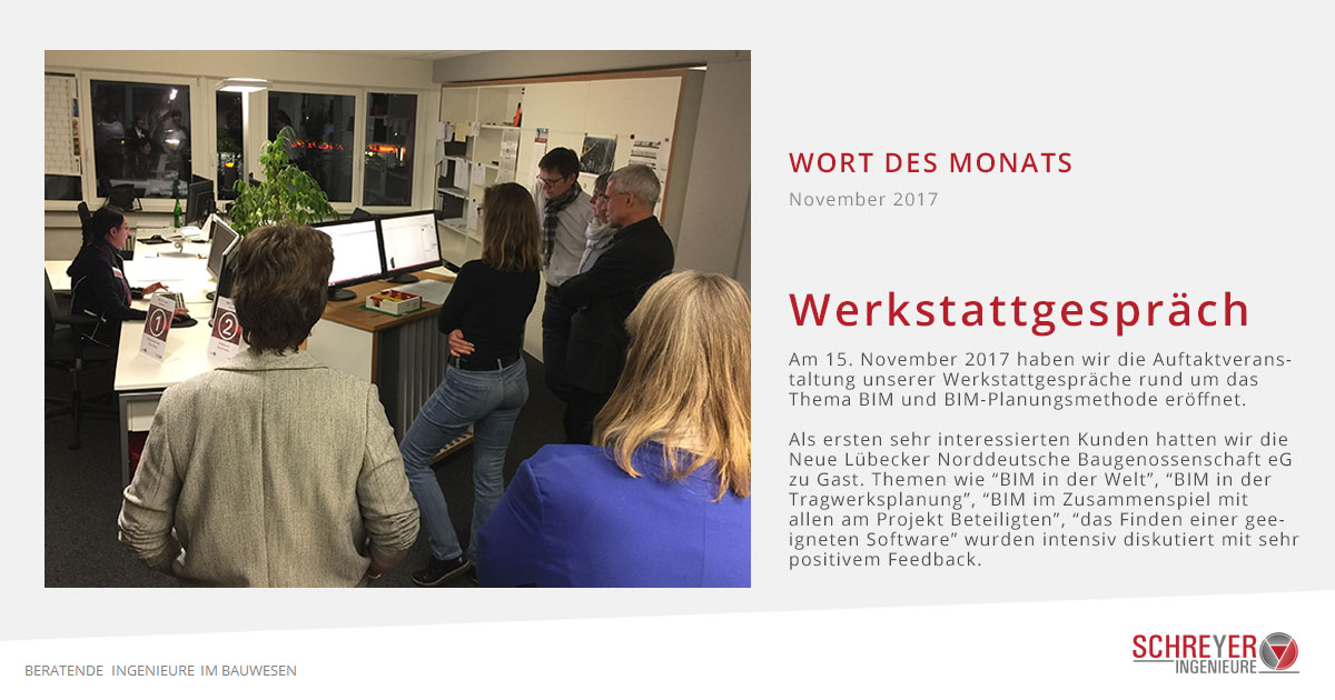 Als ersten sehr interessierten Kunden hatten wir die Neue Lübecker Norddeutsche Baugenossenschaft eG zu Gast. Themen wie “BIM in der Welt”, “BIM in der Tragwerksplanung”, “BIM im Zusammenspiel mit allen am Projekt Beteiligten”, “das Finden einer geeigneten Software” wurden intensiv diskutiert mit sehr positivem Feedback.
