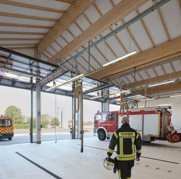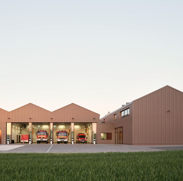 Der Ersatzneubau wird als 2-geschossiges Feuerwehrgebäude errichtet. Im Erdgeschoss befinden sich Werkstatträume, Umkleide- und Sanitärräume, die Fahrzeughalle sowie Schulungs- und Veranstaltungsräume im vorderen Bereich. Im 1. Obergeschoss befinden sich Verwaltungsräume, die Haustechnik, Lagerräume und ein Mehrzweckraum.
