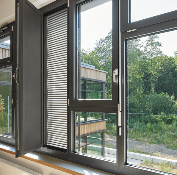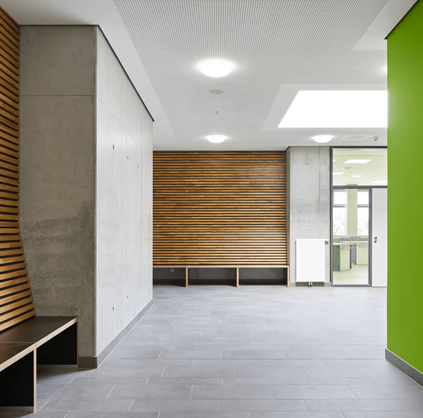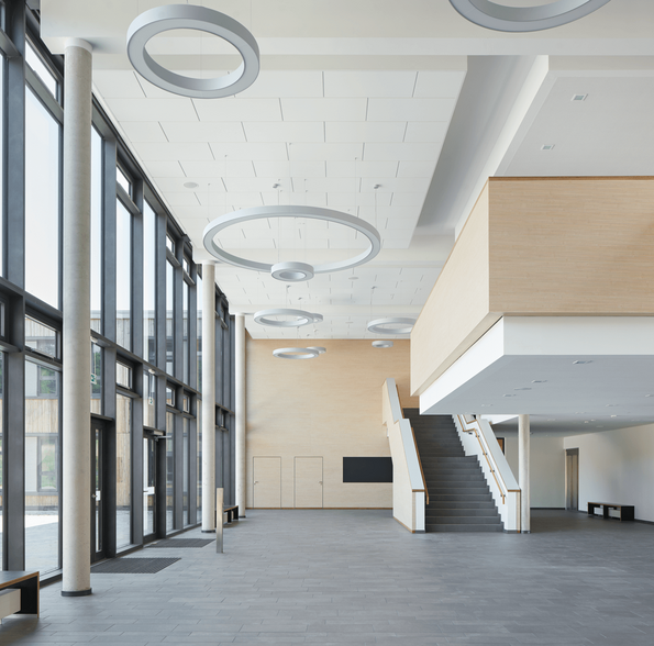 Der mittlere Gebäudeteil ist eine zweigeschossige Aula mit Mensa, welche über Stahlbetonunterzüge im Inneren stützenfrei konstruiert wurde.