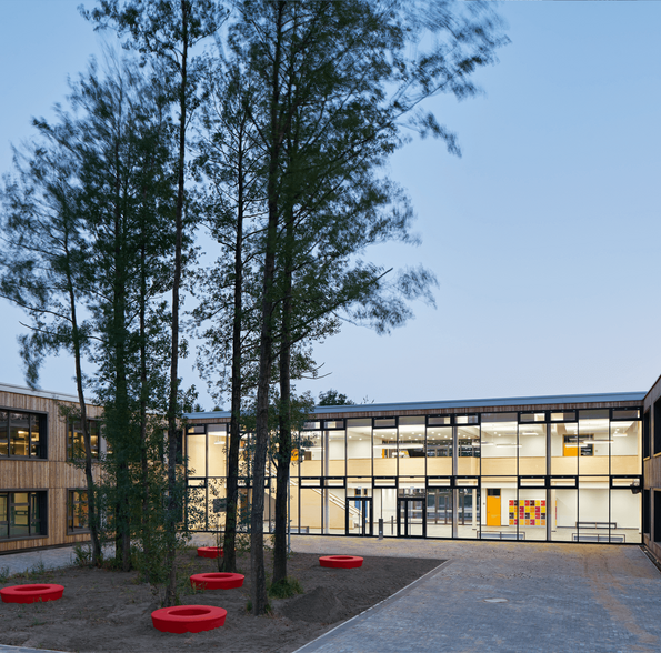 Am Übergangsbereich vor den bestehenden Schul- und Sportbauten des Gymnasiums zu einem großzügig durchgrünten parkähnlichen Gelände entwickeln wir einen maßstäblichen aufgelockerten zweigeschossigen Baukörper, der die besondere Schnittstelle zwischen Campus und Grün für die Entwicklung seiner räumlichen Qualitäten nutzt. Entsprechend dem pädagogischen Konzept werden Jahrgangshäuser mit großzügigen Freilernzonen zu einem dezentralen, aber zusammenhängenden Haus gefügt. Die Mitte bildet eine zweigeschossige Aula mit Mensa als multifunktionaler Treffpunkt. Zum Campus erhält die Schule Fassaden mit regelmäßiger Befensterung, während zum Grün hin großzügige, bodentiefe Öffnungen der Freilernzonen den Bezug zur Natur herstellen.