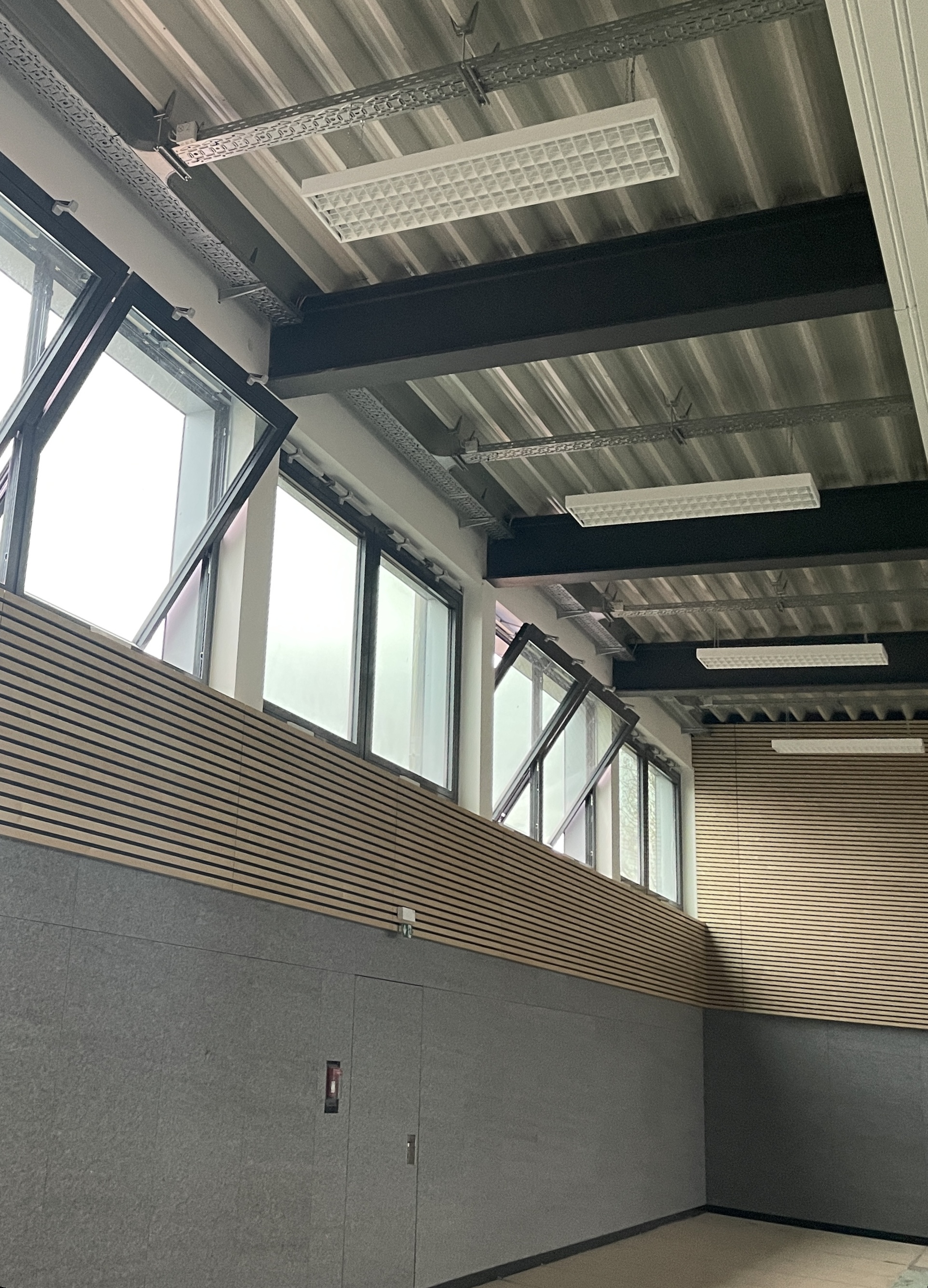Bei dem bestehenden Schulgebäude wurden die Walmdächer abgebrochen und durch neue Stahlbeton-Flachdächer ersetzt. Diese liegen auf dem Bestandsmauerwerk auf und ermöglichen so die Erschließung des obersten Geschosses über die externen Treppenhäuser.