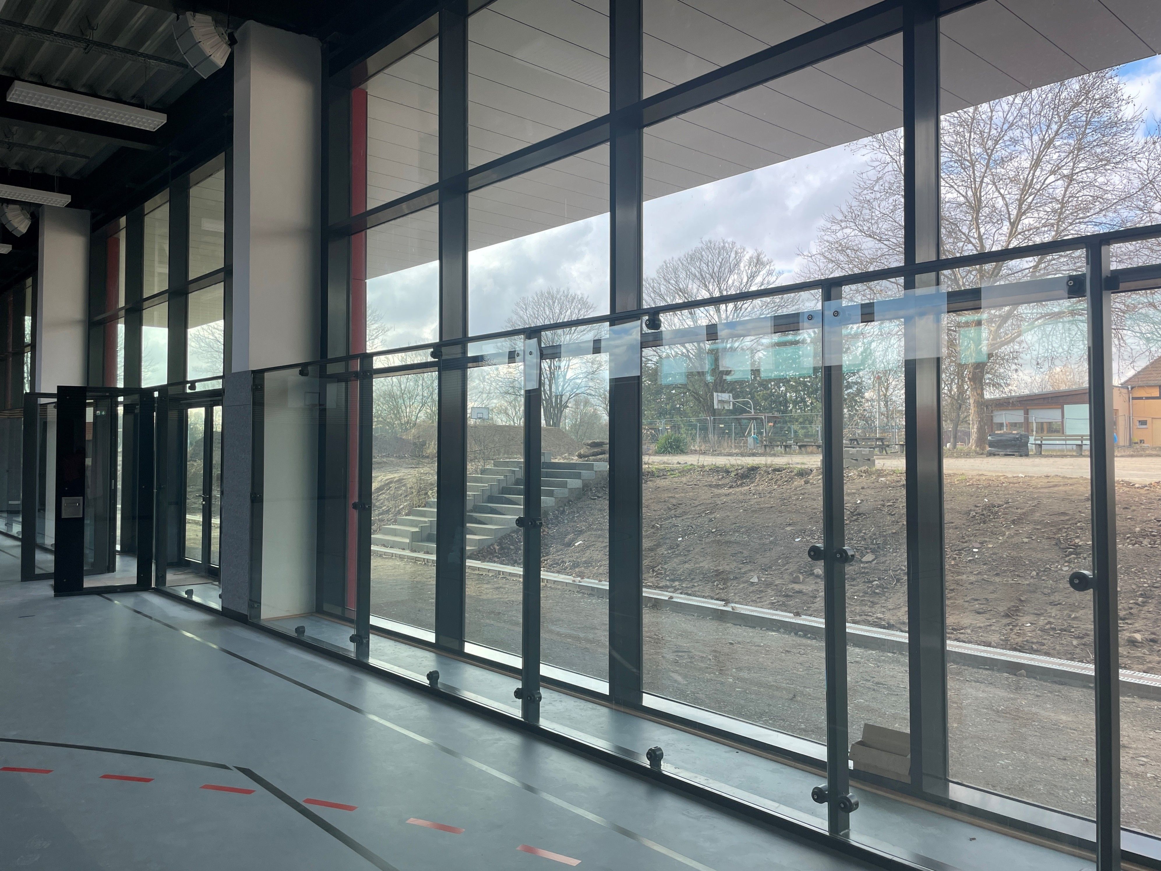 Die Sporthalle ist eine hybride Konstruktion, mit Bodenplatte und Stützen aus Stahlbeton. Die Wände gemauert und das Dach aus Trapezblech liegt auf auskragenden Stahlträgern auf. Die Dachkonstruktion wurde bemessen, um zukünftig auch eine Photovoltaikanlage tragen zu können. Dreiseitig ist die Halle bis zu 1,5m im Erdreich eingegraben. In diesen Bereichen ist eine Stahlbetonwand als Sockel gebaut.