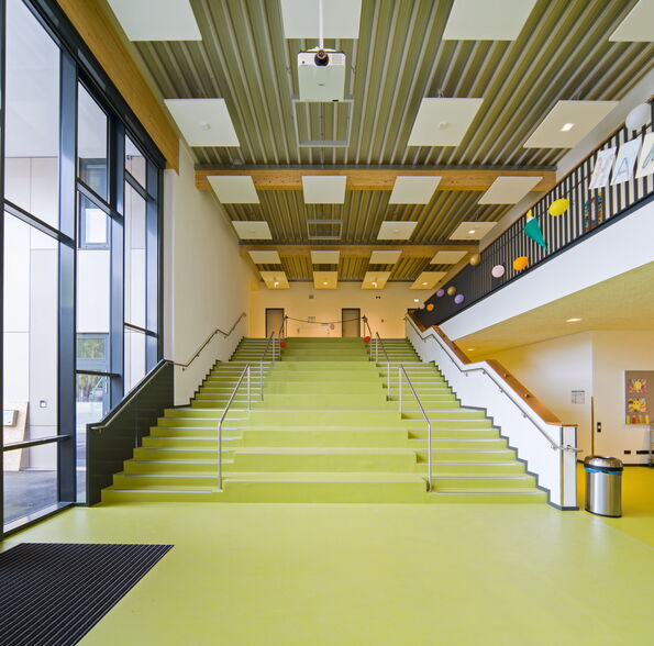 Der Hortbereich grenzt an eine 198 qm große Multifunktionshalle mit abtrennbarer Mensa und einer separaten Essensausgabe (30 qm).