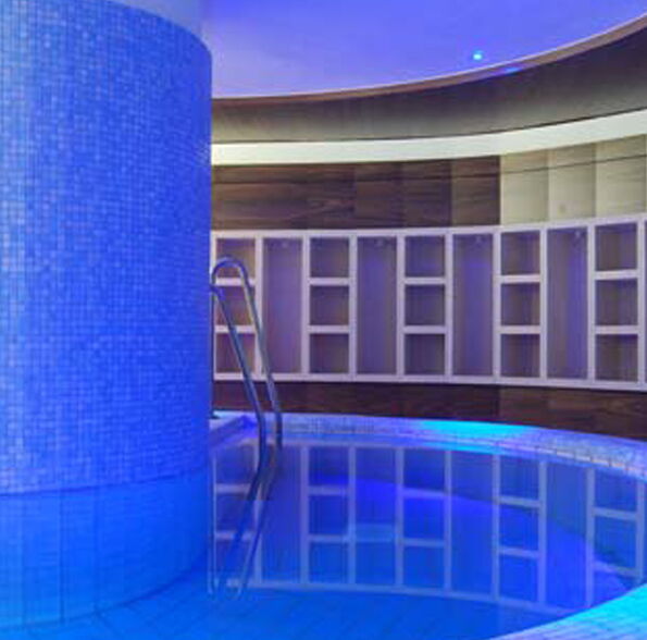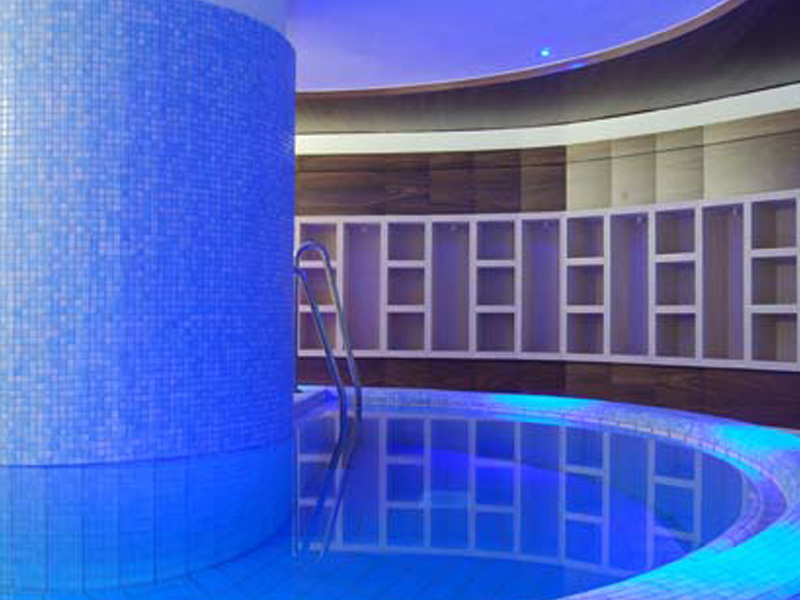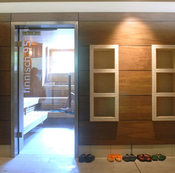 Der bestehende Saunabereich erfährt eine grundlegende Umplanung und Aufwertung zum Day Spa. Innere Fassaden aus Walnussholzpaneelen erzeugen in einer Kombination mit Stahl und Glas ein hochwertiges und zeitloses Ambiente.