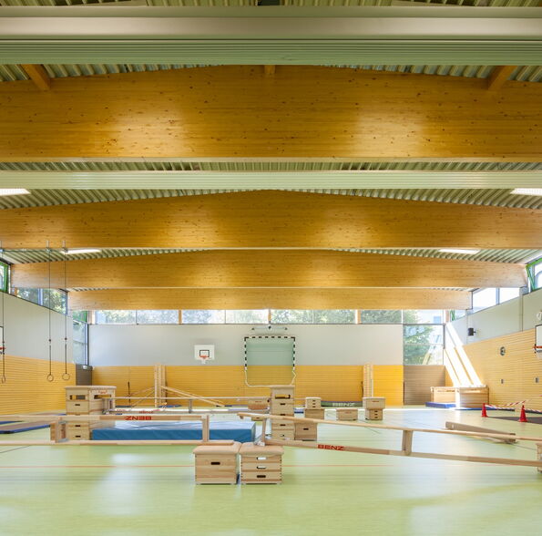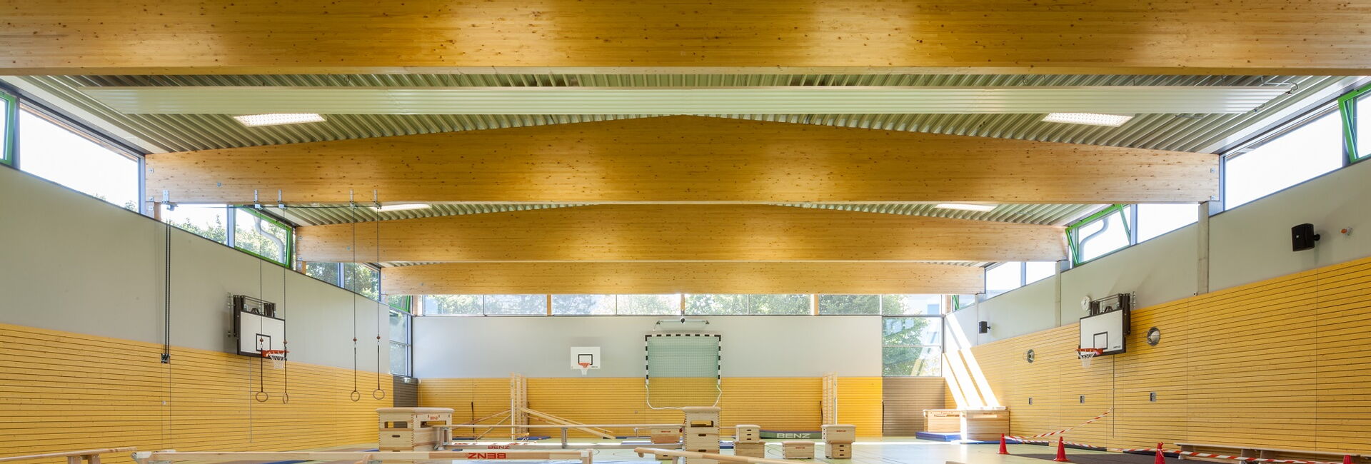 Der Entwurf der 2-Feld-Sporthalle wird größtenteils als Holzbau ausgeführt.Die Dacheindeckung besteht aus Trapezblech mit aufliegender Wärmedämmung und einer Foliendachabdichtung. Das Trapezblech wird als Schubfeld ausgebildet. Die Dachkonstruktion ist auf Satteldachbindern aus Brettschichtholz aufgelagert. Die Binder geben ihre Lasten über Stahlbetonstützen in die Gründung ab. Die Außenwände werden als Holzständerwände mit vorgemauerter Verblendschale, bzw. als PRK-Glasfassaden vor tragenden Holz- bzw. Stahlstützen ausgeführt. An die Sporthalle grenzt ein eingeschossiger Technik-, Geräte- und Nebenraumtrakt mit Sanitärräumen, welcher die Aussteifung in Querrichtung über angeschlossene Stahlbetonstützen übernimmt. In Längsrichtung werden die Aussteifungslasten über das Schubfeld an die Außenwandstützen übergeben. Die Holzstützen werden über kraftschlüssig angeschlossene Holzrahmenbauwände gehalten. Der untere Teil der Sporthalle erhält als unteren Abschluss eine Stahlbetonwand als ca. 2,80 m hohe Aufkantung zur Lastverteilung der äußeren Einzellasten
