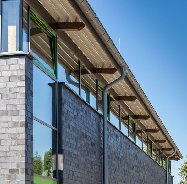 Der Architekt gräbt die Halle um ca. 2,80 m ein. Dadurch ordnet sich der Baukörper insbesondere in seiner Höhenentwicklung sehr angenehm in den städtebaulichen Kontext der beiden Schulen einschließlich der neuen Mensa ein. Konsequent betritt man das Gebäude auf der oberen Ebene der Umkleideräume und erreicht das Hallenniveau über zwei Treppen bzw. barrierefrei über einen Aufzug. Die Nebenräume werden auf der Westseite, d.h. auf der dem Campus - bzw. der Erschließungsachse abgewandten Seite, angeordnet. Die Materialien im Äußeren (Grauer Ziegel und Streckmetall) sind in grauem Ziegel und Streckmetall mit einer klaren und schlichten Farbgebung der Oberflächen gerplant.