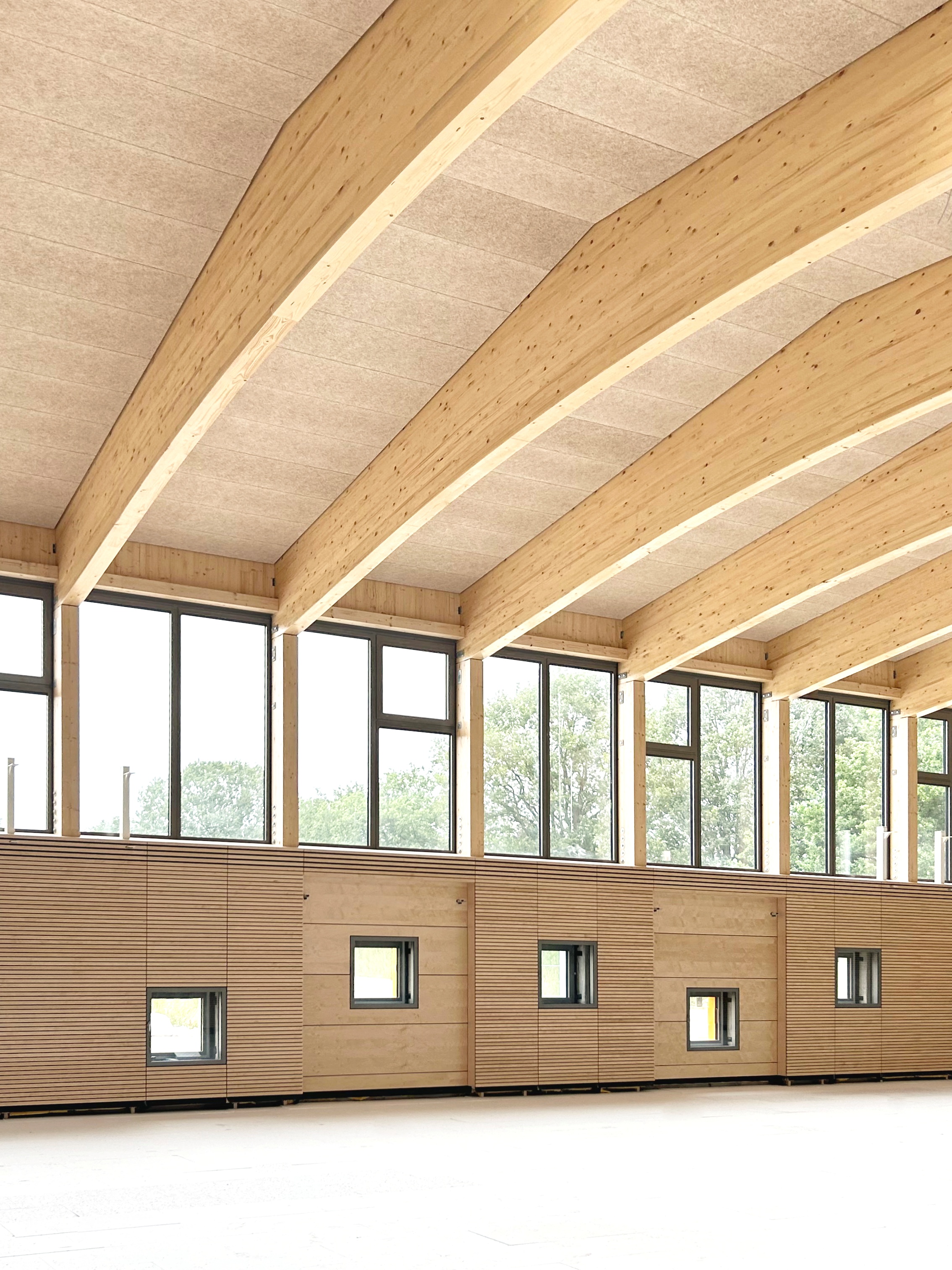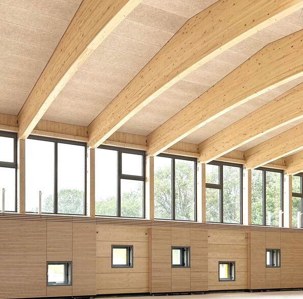 Das Schulgebäude ist ein- bis zweigeschossig, mit unterschiedlichen Konstruktionsarten für verschiedene Gebäudeteile. Die beiden sogenannten "Klassenhäuser" sind vollständig in Holzrahmenbauweise errichtet, während das Hauptgebäude in seinen tragenden Bauteilen als Massivbau aus Kalksandstein-Mauerwerk bzw. Stahlbeton konstruiert wurde. Für die Dächer und Decken wurden in den meisten Teilen vorgespannte Elementdecken verwendet. Der mittlere Teil des Hauptdaches wurde in Holzbauweise als Pfettendach mit Stahlträger errichtet und die Dachkonstruktion über den zweigeschossigen Hallen besteht aus Bindern aus Brettschichtholz und einem darüber liegenden Trapezprofil. Auch die Dächer über den Klassenhäusern sind Pfettendächer aus Holz.