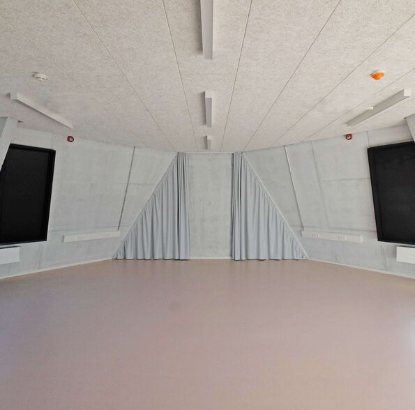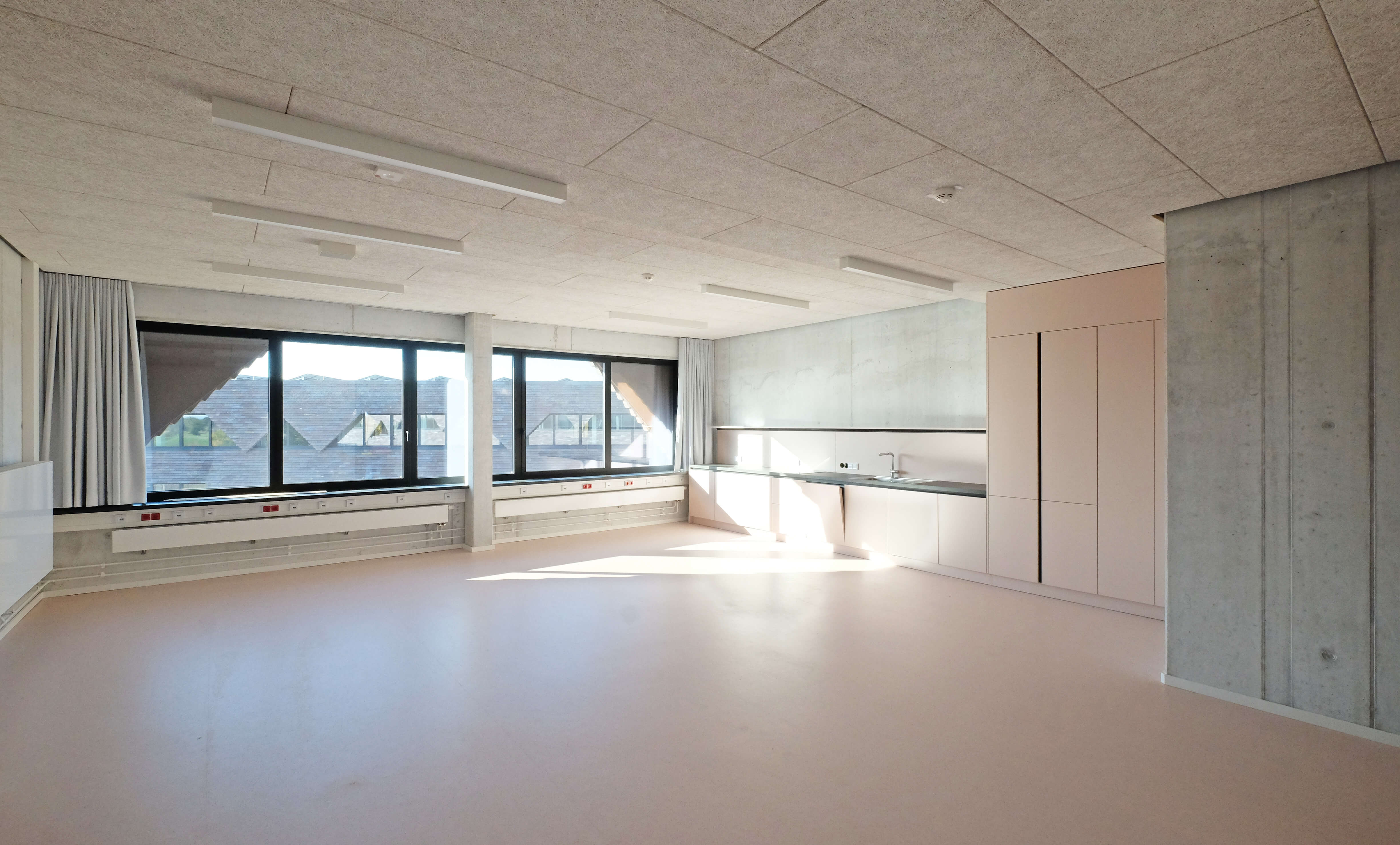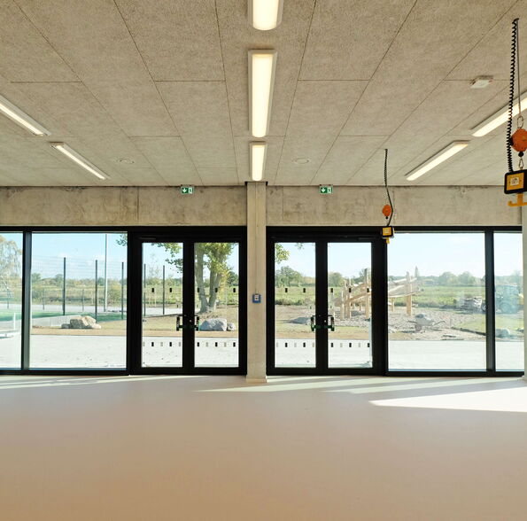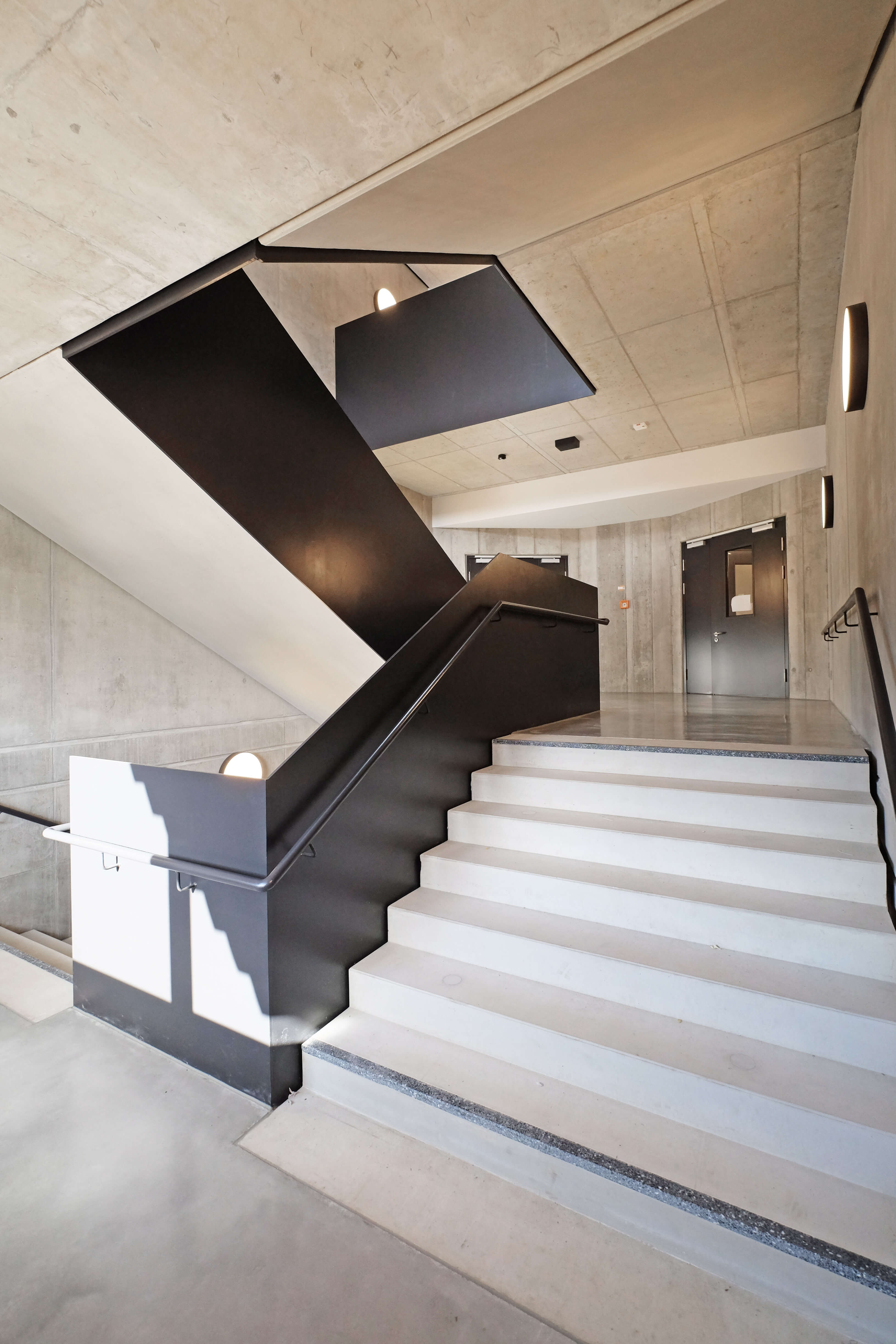 Die unterspannten Holzdachbinder leiten über eine Sparrenpfettenlage und eine Holzdecke die Wind- und Aussteifungs-lasten in die Giebelwände und die Längswände in HRB.-Bauweise. Bei den Schulgebäuden handelt es sich ebenfalls um eine hybride Konstruktion. Das Haupttragwerk ist eine Stahlbetonskelettkonstruktion. Vor diesem Tragwerk ist ein selbst-tragendes Holztragwerk mit Zwischendämmung vorgesehen.