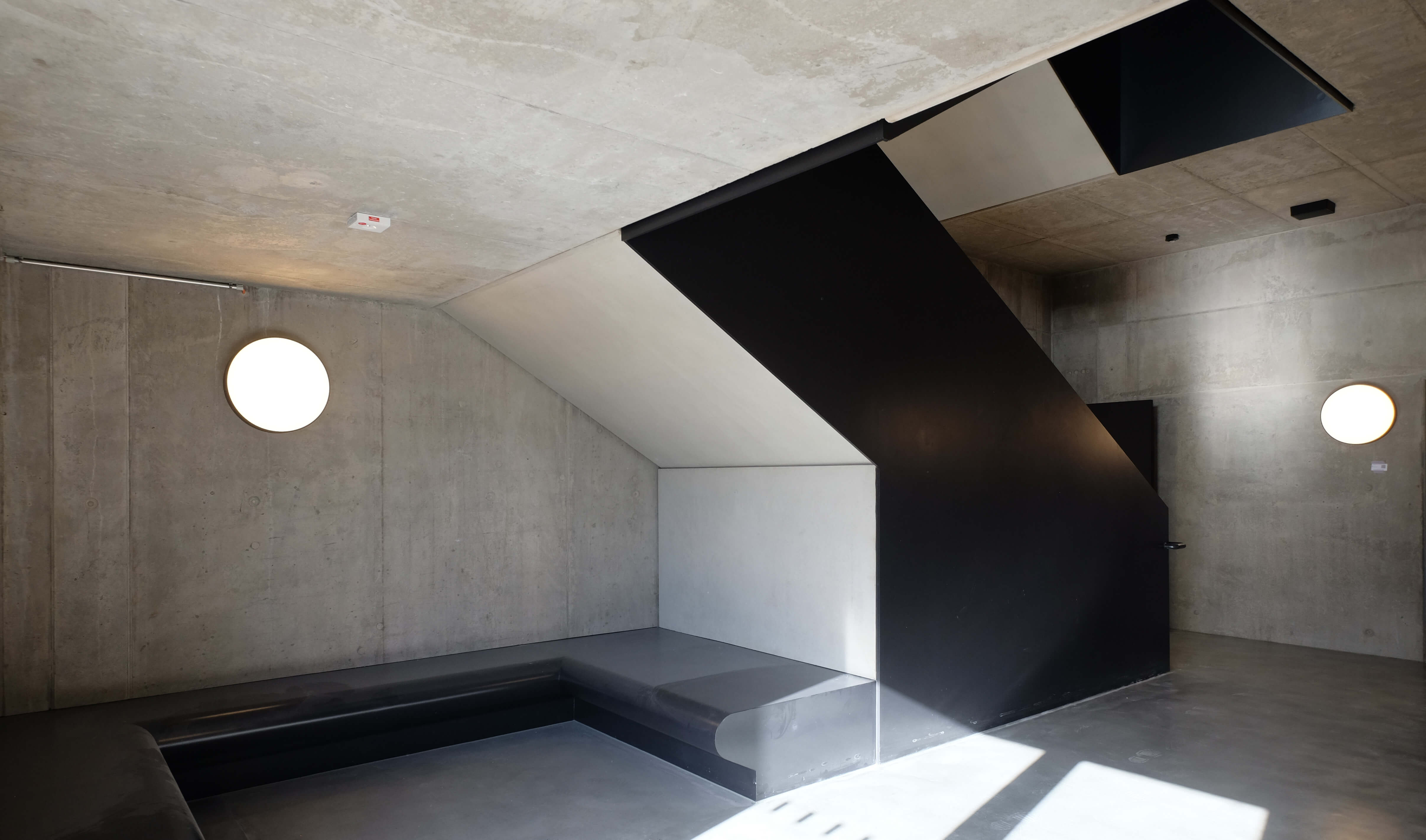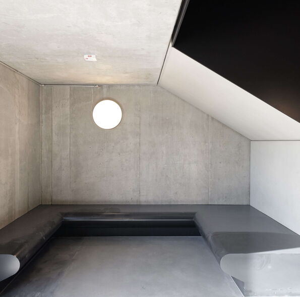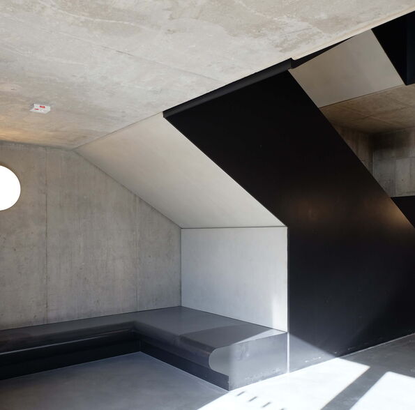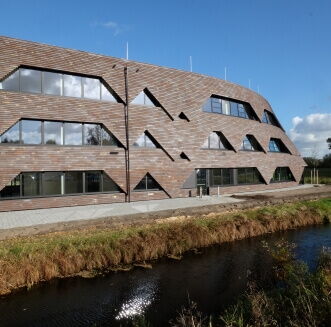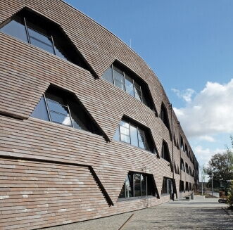 Die Fassade überragt die letzte Geschossdecke um ca. 0,75 m und bildet die Attika aus, welche das extensive Gründach abschließt. Die Fassade wird komplett in Tonziegeln ausgeführt. Sie bedecken sowohl die geneigten als auch die vertikalen Bereiche.