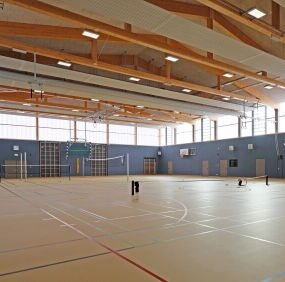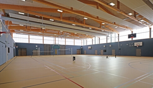 Die Sporthalle wurde in ihren tragenden Bauteilen in Holzhybridbauweise errichtet. Die Außenwände der Sporthalle (Halle und Nebentrakte) wurden als tragende Holzrahmenbauwände geplant. Die Halle selbst ist ein Ing.-Holzbau.