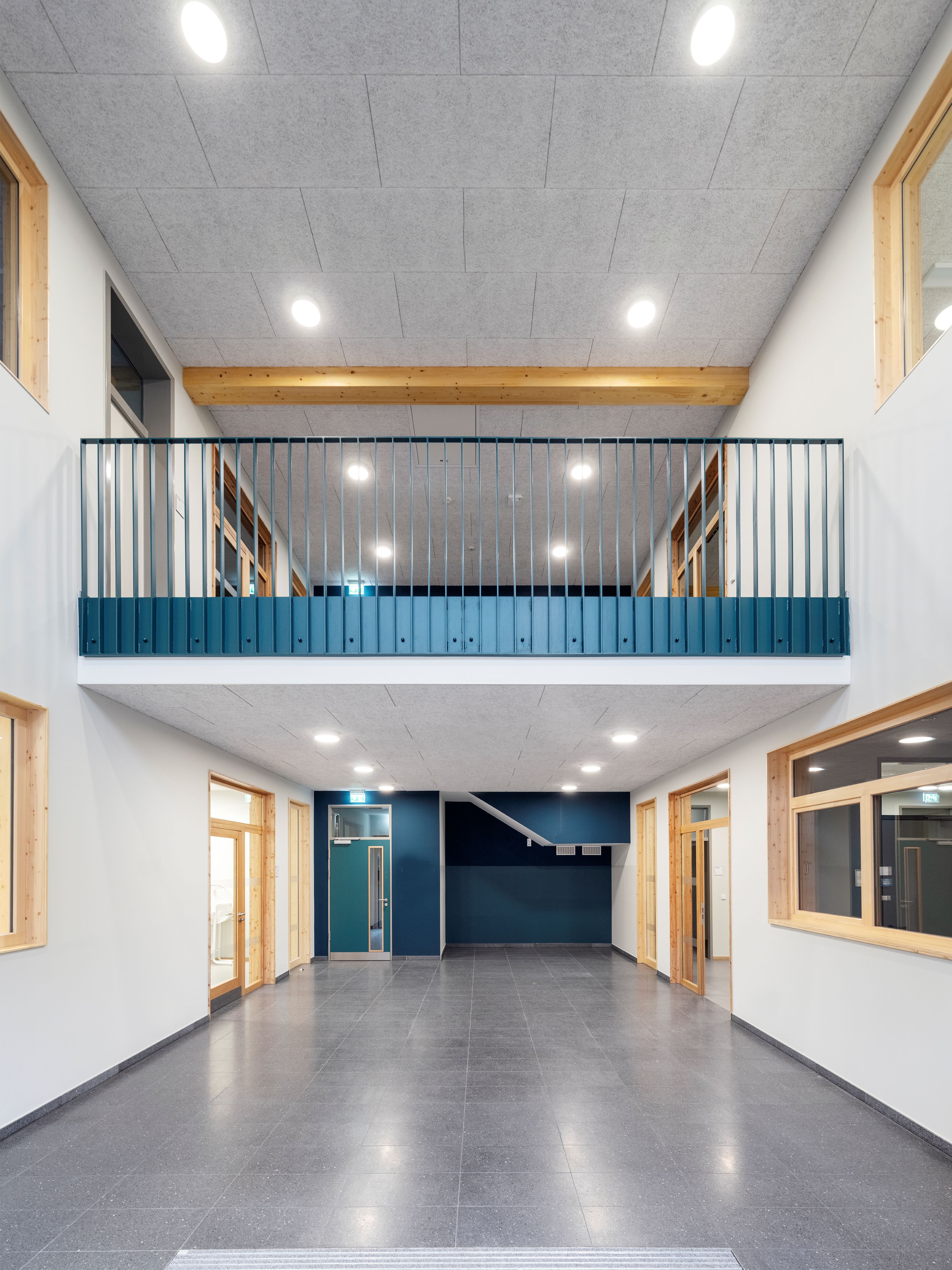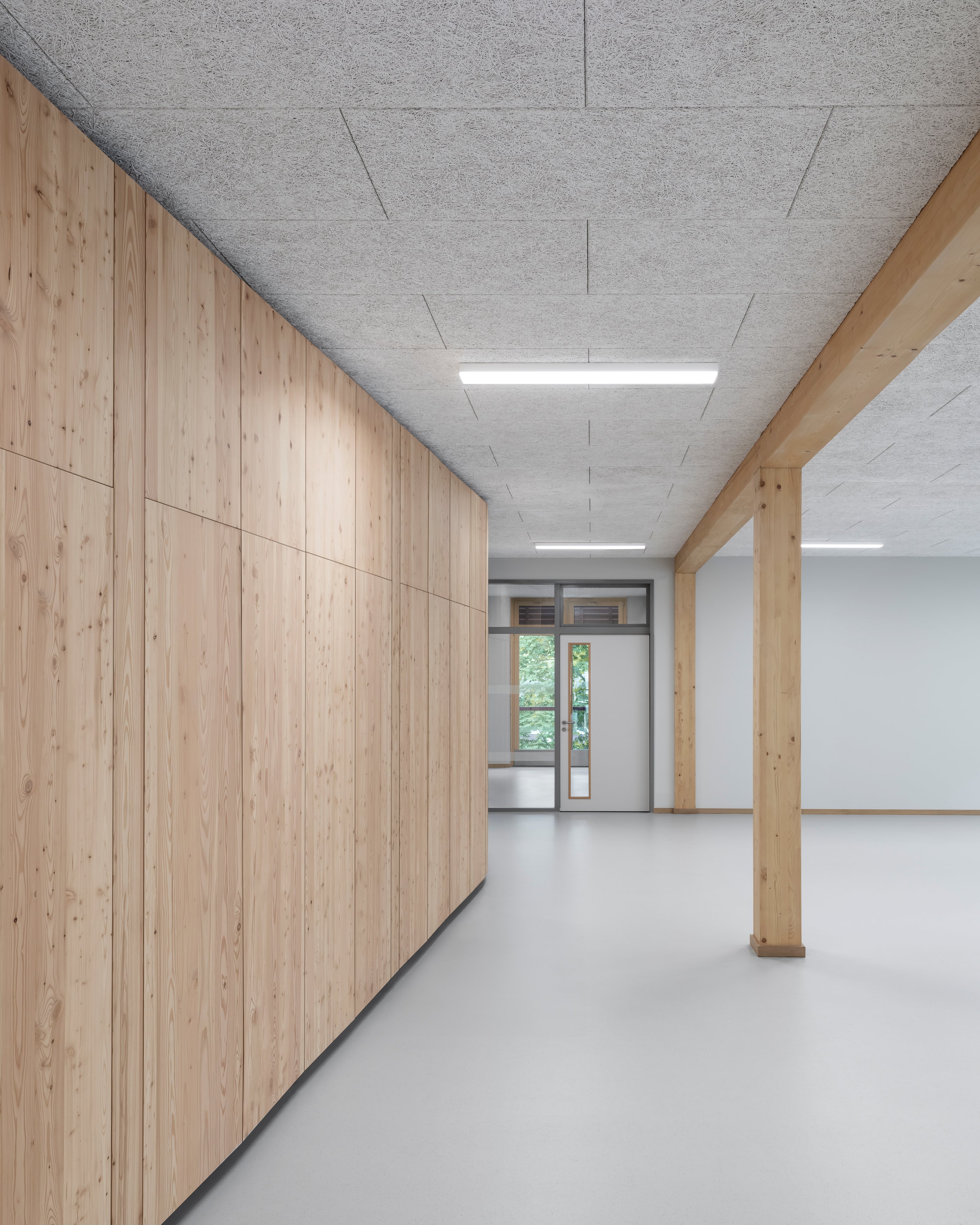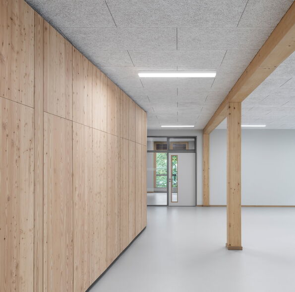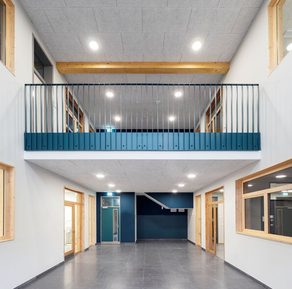 Die Hamburger Klassenhäuser werden mit vorgefertigten tragende Bauteile in Stahlbeton-, Holz- oder Holzhybridbauweise konzipiert. "De Stuuv" ist ein Holzhybridbau und besteht aus vorgefertigten Holzrahmenbauwänden, Spannbetonhohldielen und einem Satteldach aus Fachwerkbindern.