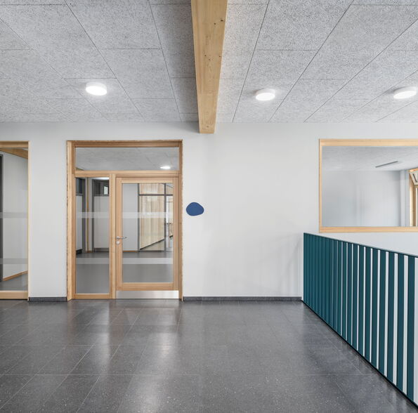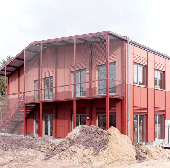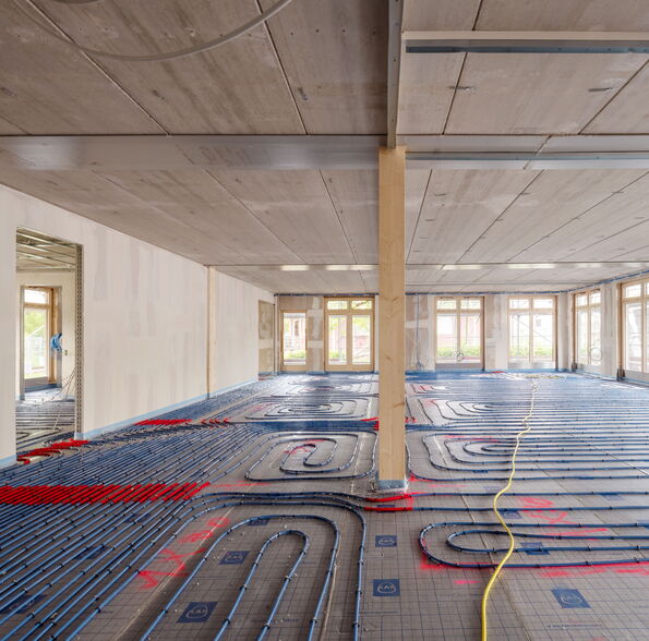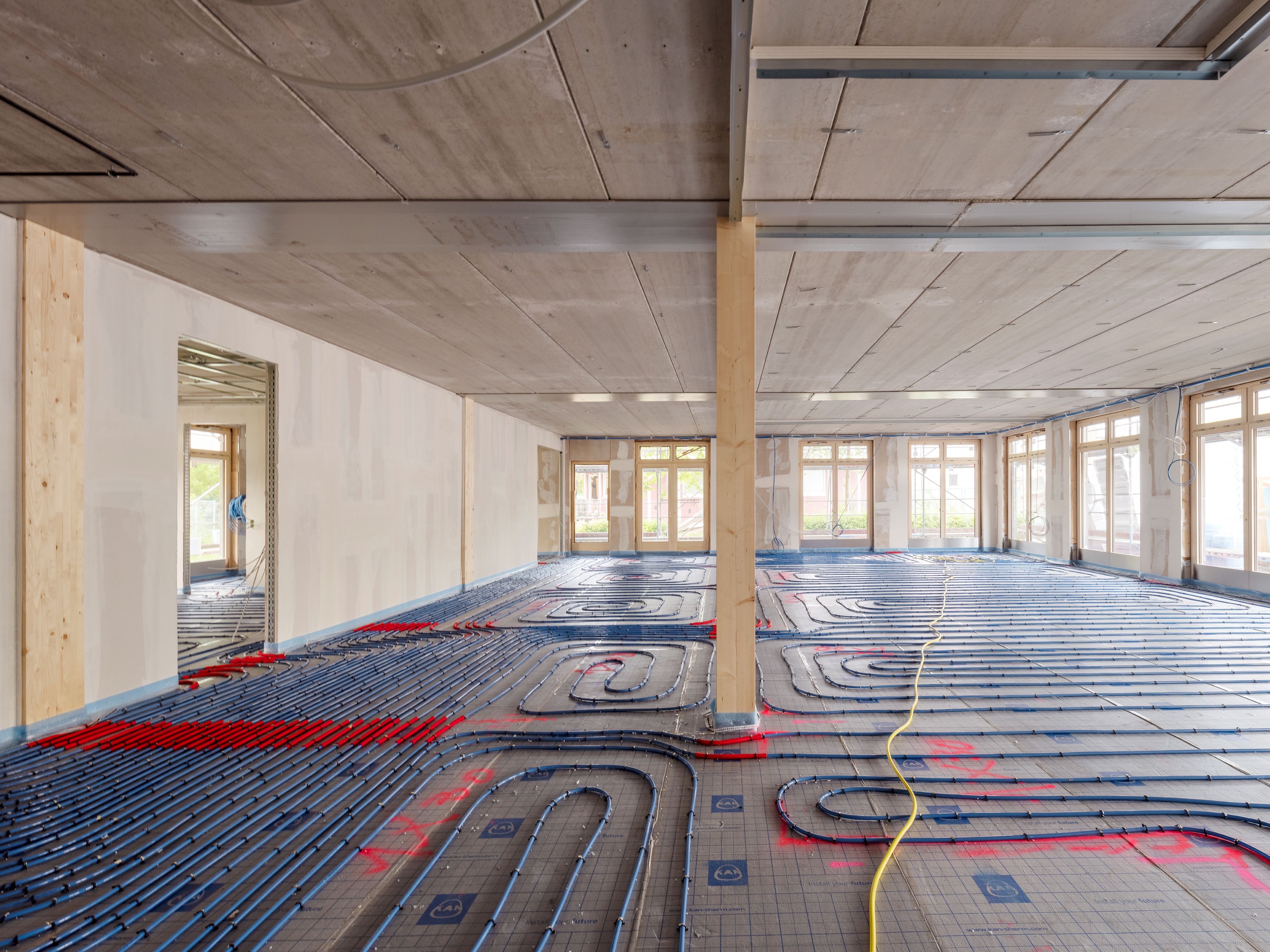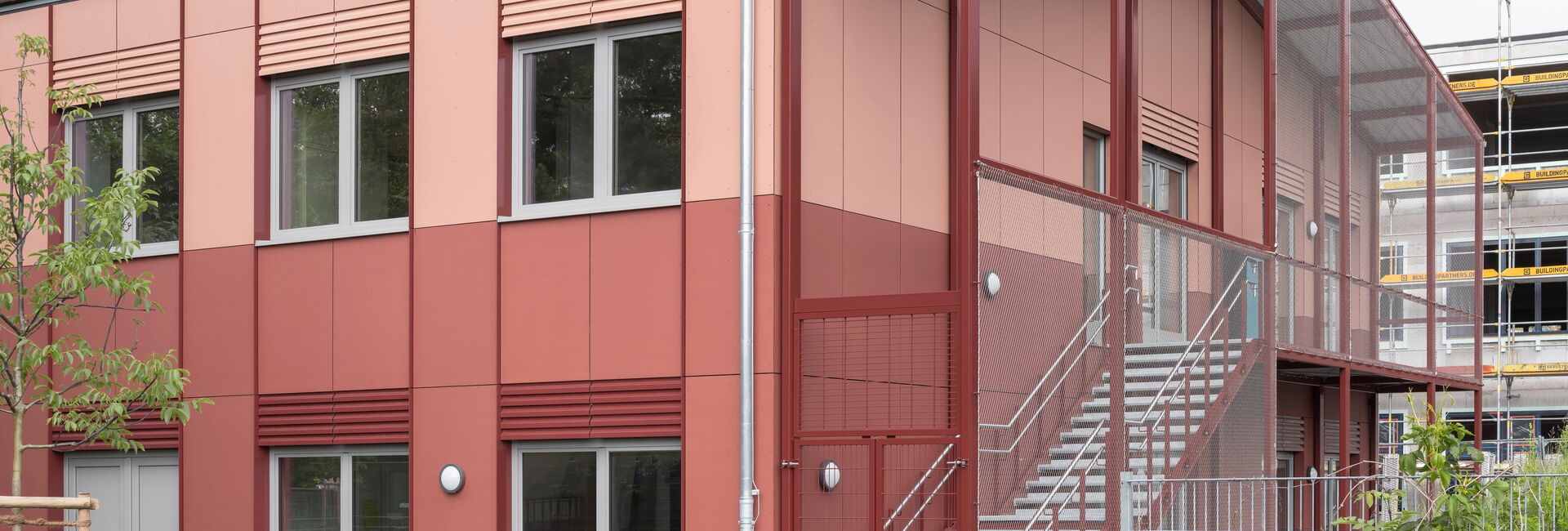 Die Hamburger Klassenhäuser werden mit vorgefertigten tragende Bauteile in Stahlbeton-, Holz- oder Holzhybridbauweise konzipiert. "De Stuuv" ist ein Holzhybridbau und besteht aus vorgefertigten Holzrahmenbauwänden, Spannbetonhohldielen und einem Satteldach aus Fachwerkbindern.