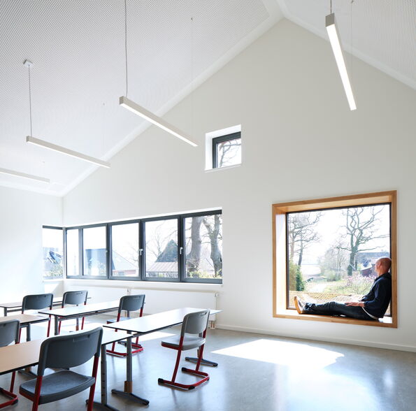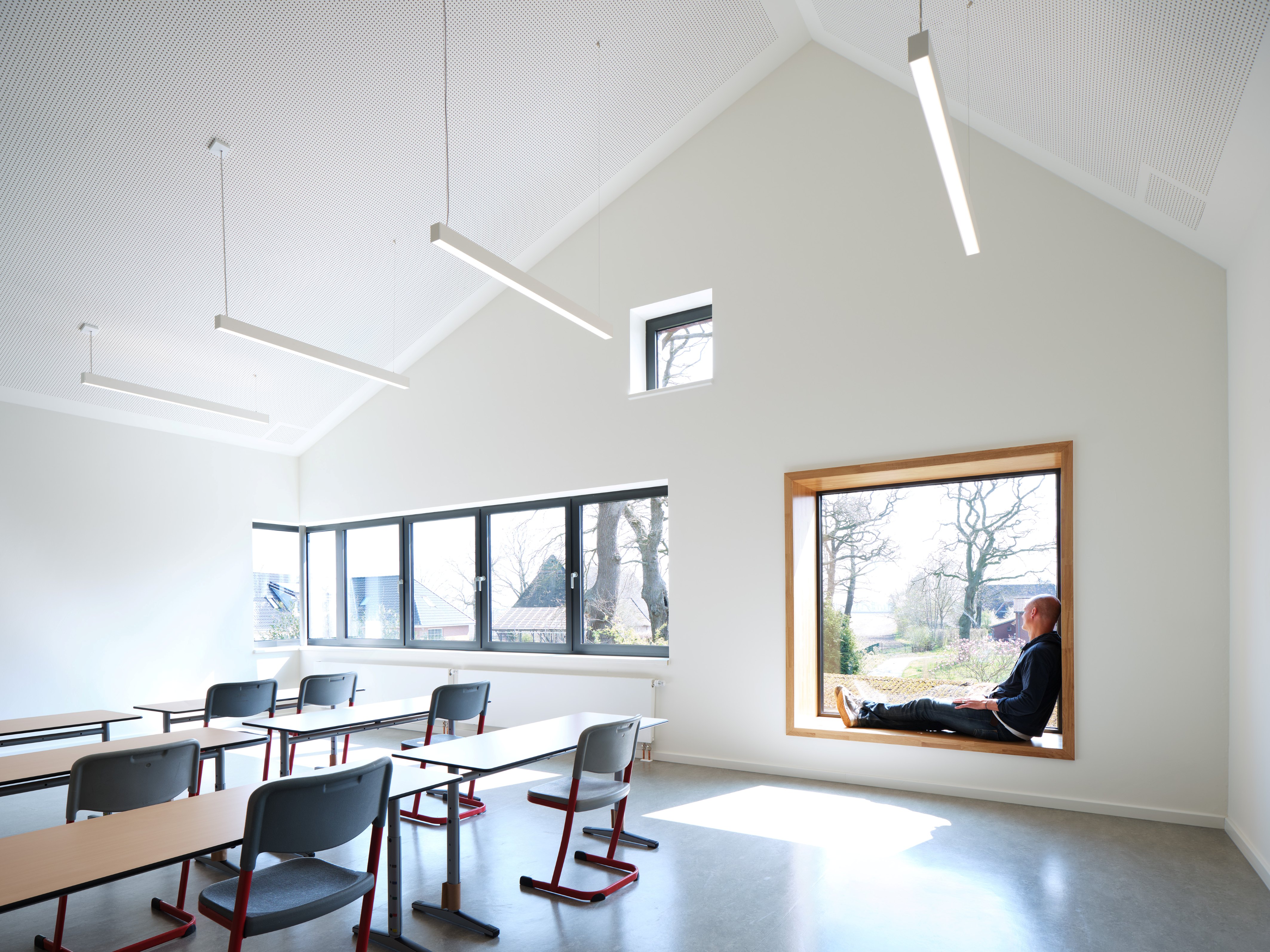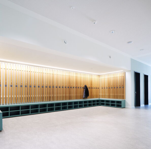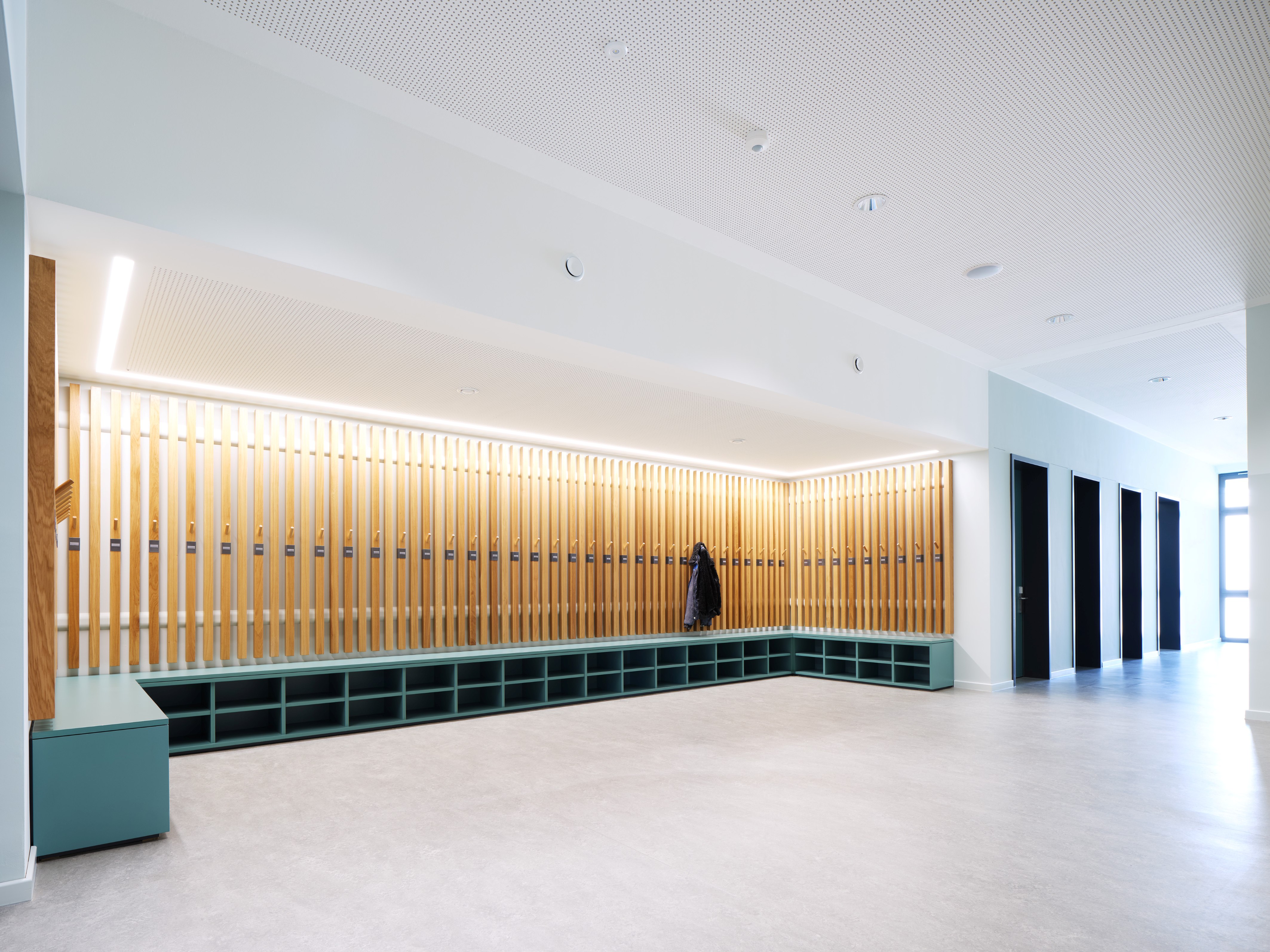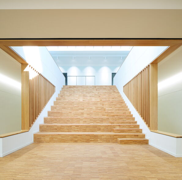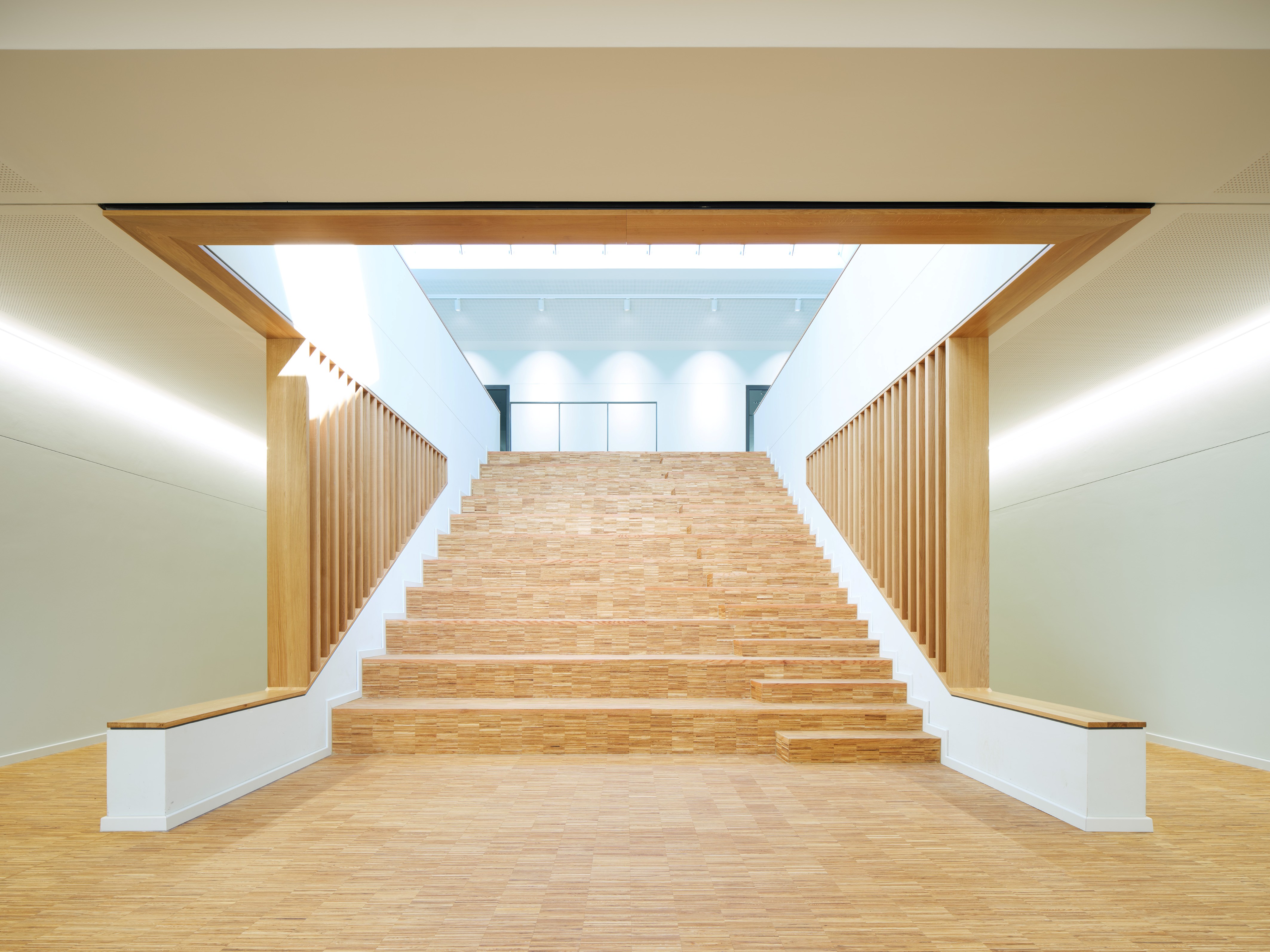 Ergänzt wird das Raumangebot durch Fachräume für Musik und Kunst, Räume für Förderunterricht sowie für die Ganztagsbetreuung. Darüber hinaus stehen Räumlichkeiten für das Lehrpersonal, administrative Aufgaben und notwendige Nebenfunktionen zur Verfügung. Das Gebäude ist um eine zentrale, offene Sitztreppe organisiert, die als architektonischer und sozialer Mittelpunkt fungiert. Alle übrigen Räume gruppieren sich um diesen zentralen Bereich herum, was kurze Wege und eine gute Orientierung im Gebäude ermöglicht.