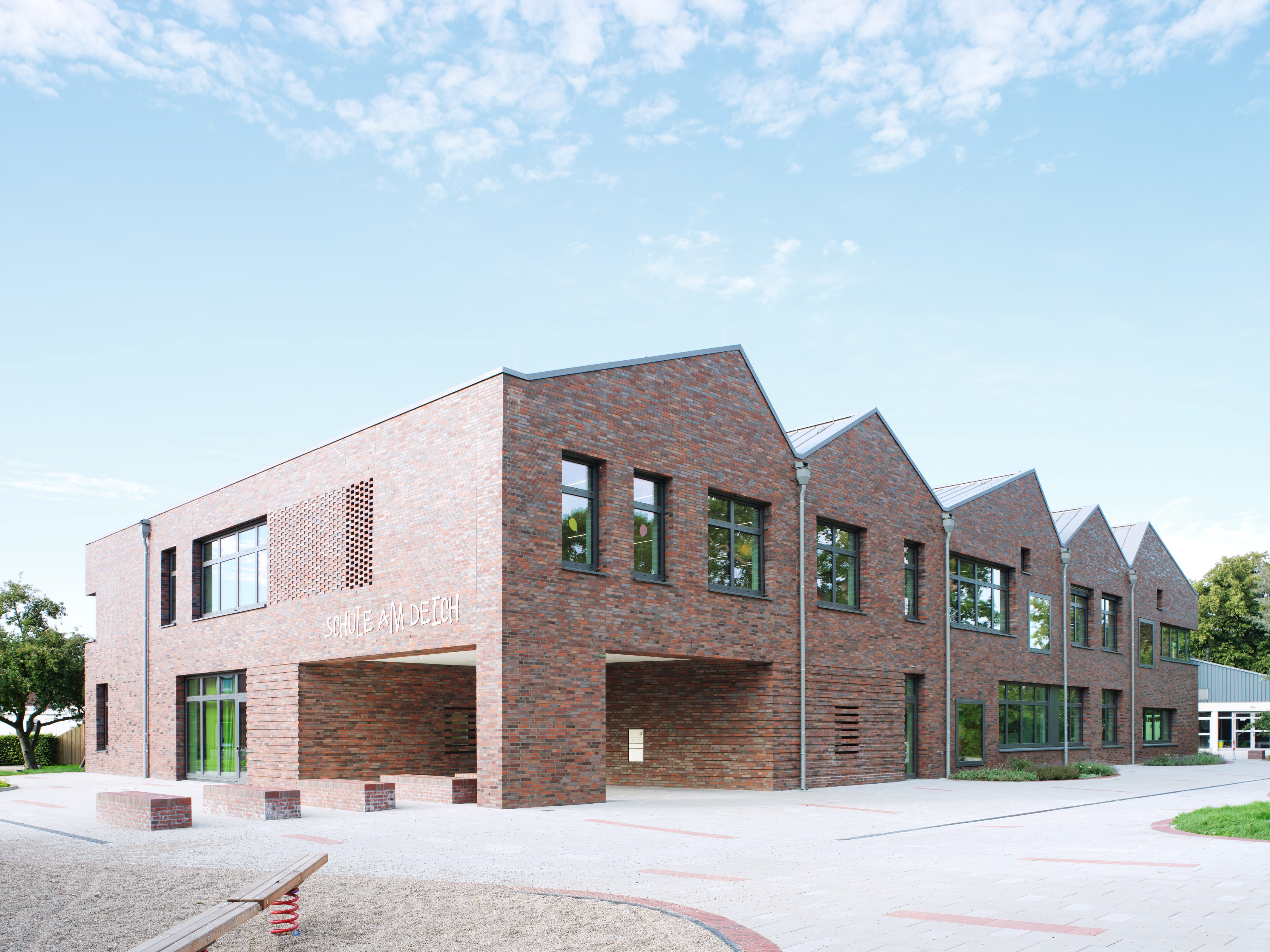 Die Fassade ist mit Ziegeln verkleidet und fügt sich harmonisch in die dörfliche Backsteinarchitektur der Umgebung ein. Die Dachlandschaft wird durch mehrere giebelartige Elemente gegliedert, was dem Baukörper eine kleinteilige Anmutung verleiht und ihn in Maßstab und Erscheinung an die umliegende Bebauung angleicht.