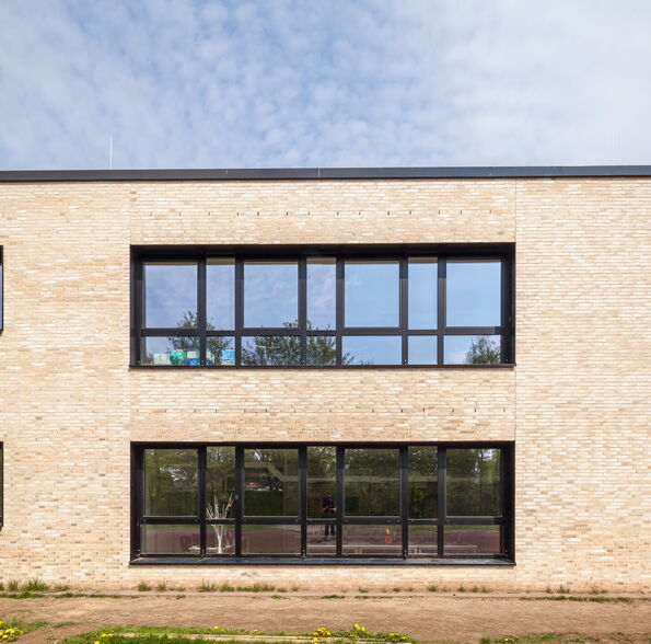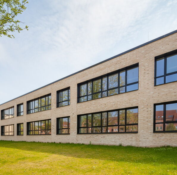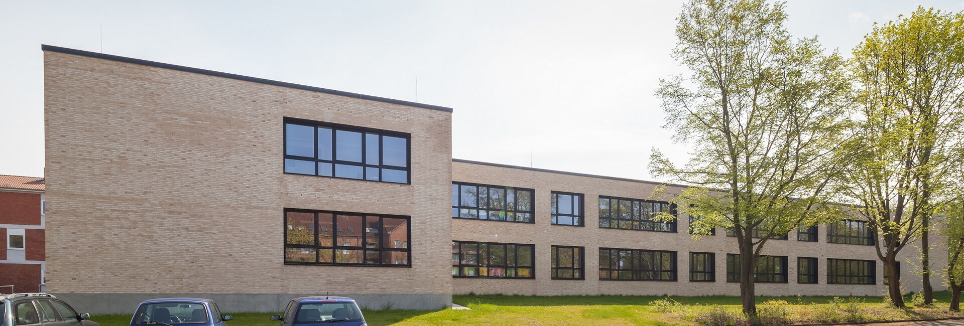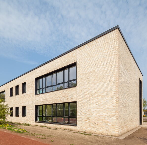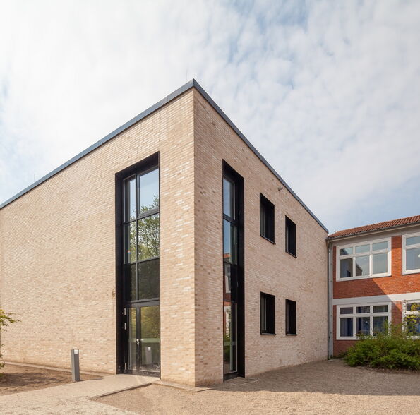 Die Bestandsschule ist aus drei schlanken, parallelen, 2-3 geschossigen Gebäudetrakten und einem erdgeschossigen Verbindungsgang gefügt. Der Erweiterungsbau aus allgemeinen Unterrichts- und Fachunterrichtsräumen legt sich direkt an den nordwestlichen Trakt an, so dass eine funktionale Einheit entsteht. Er setzt sich jedoch in seiner Form und Gestaltung vom 1960er Jahre Bestand ab, um als Neubau ablesbar zu sein.