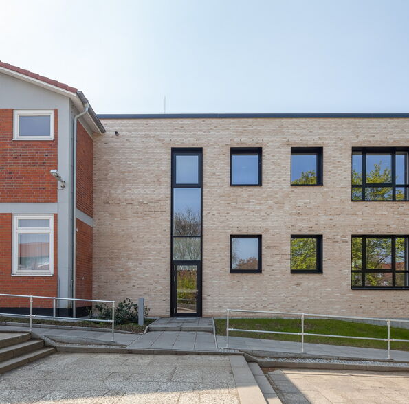 Das Gebäude wird außen und innen in seinen tragenden Bauteilen aus massiven Baustoffen aus Mauerwerk bzw. Stahlbeton errichtet. Die Außenwände sind in großen Teilen mit einem Verblendmauerwerk versehen. Die Geschossdecken werden ebenfalls aus Stahlbeton bzw. Spannbetonhohlplatten ausgeführt.