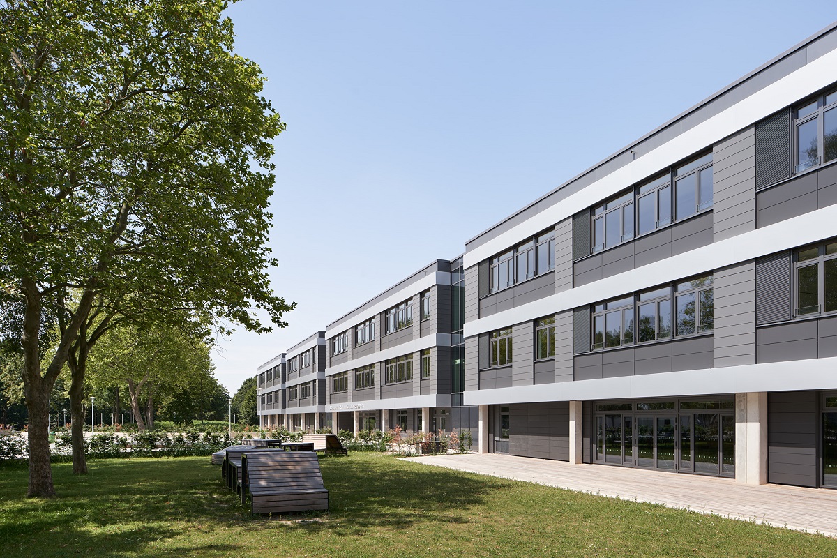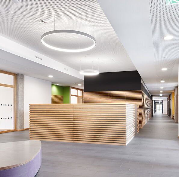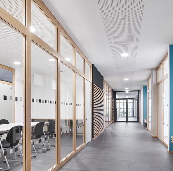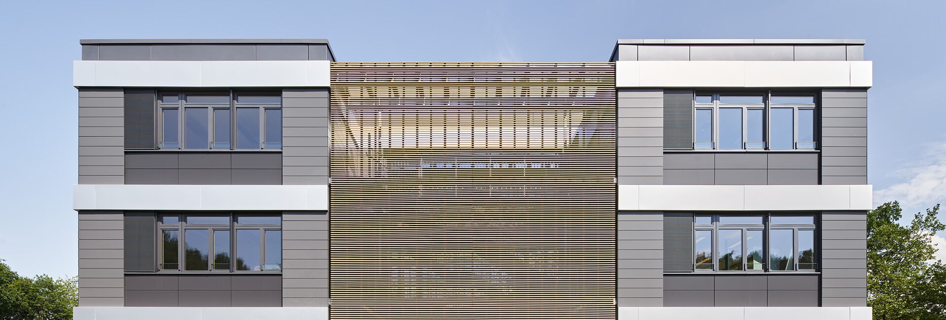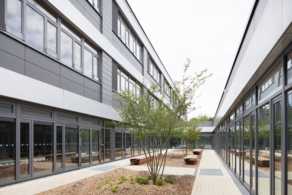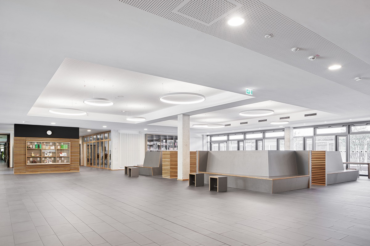 Die neue Fassade wurde als Holzrahmenkonstruktion vor dem vorhandenen Betontragwerk angebracht. Der Abbruch vorgelagerter Gebäudeteile ermöglicht nun eine bessere Nutzung des Tageslichts. Ein heller Innenhof, ein offener Lernbereich im Obergeschoss und die Verwendung von Holzelementen im Innenbereich verstärken den freundlichen Charakter des sanierten Gebäudes. Das Ergebnis ist ein zeitgemäßes, energetisch optimiertes und hochwertig ausgestattetes Schulgebäude.