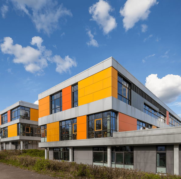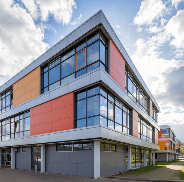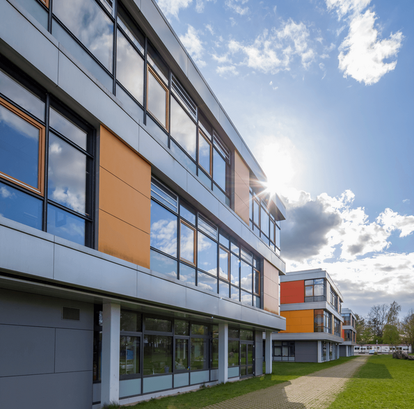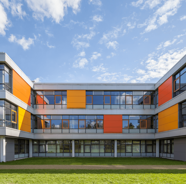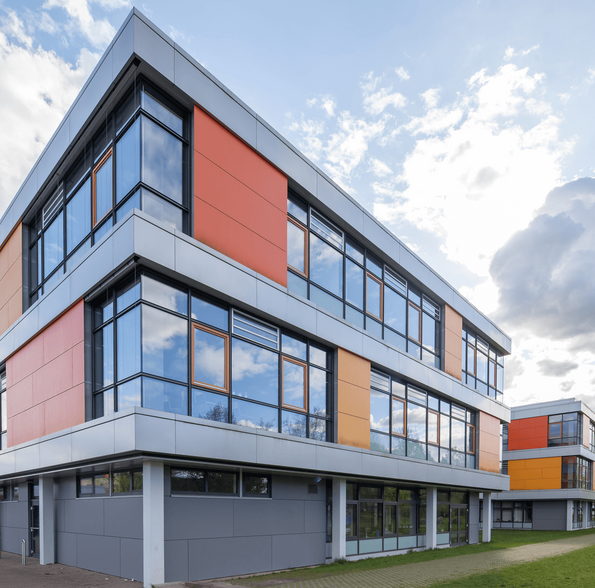 Das Schulzentrum in Glinde wurde 1976 in Stahlbetonfertigteil-Bauweise nach dem „Kasseler Modell“ gebaut, Aufgabe war die Erweiterung der Schule sowie die energetische Sanierung der Fassaden.