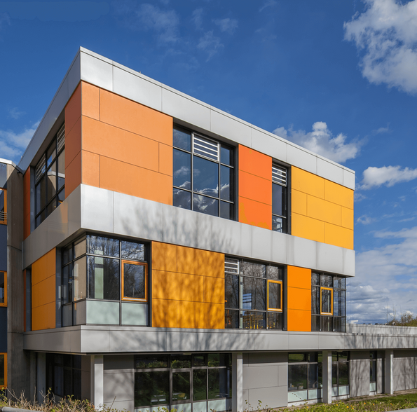 Die Fassade der Aufstockung ist aus Überlegungen zur langfristigen Erneuerung des Bestandsgebäudes entwickelt. Dabei wurde die neue Fassade vor die zurzeit außen liegende Betonhauptkonstruktion gelegt, um die Wärmeverluste zu minimieren und eine energetisch effizientere Außenhaut sowie einen besseren Sonnenschutz zu erhalten. Die Pfosten-Riegel-Konstruktion hat öffenbare Holzfenster und Lamellenfenster und kann daher natürlich be- und entlüftet werden. Die geschlossenen Fassadenflächen nehmen in ihrer Farbigkeit Bezug zum Bestand der 1970er Jahren, entwickeln aber das Thema zu einem eigenständigen Spiel weiter.