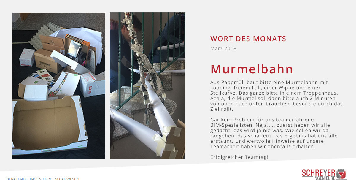 Aus Pappmüll baut bitte eine Murmelbahn mit Looping, freiem Fall, einer Wippe und einer Steilkurve. Das ganze bitte in einem Treppenhaus. Achja, die Murmel soll dann bitte auch 2 Minuten von oben nach unten brauchen, bevor sie durch das Ziel rollt.