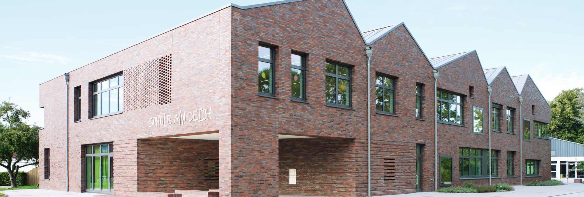 Die Fassade ist mit Ziegeln verkleidet und fügt sich harmonisch in die dörfliche Backsteinarchitektur der Umgebung ein. Die Dachlandschaft wird durch mehrere giebelartige Elemente gegliedert, was dem Baukörper eine kleinteilige Anmutung verleiht und ihn in Maßstab und Erscheinung an die umliegende Bebauung angleicht.