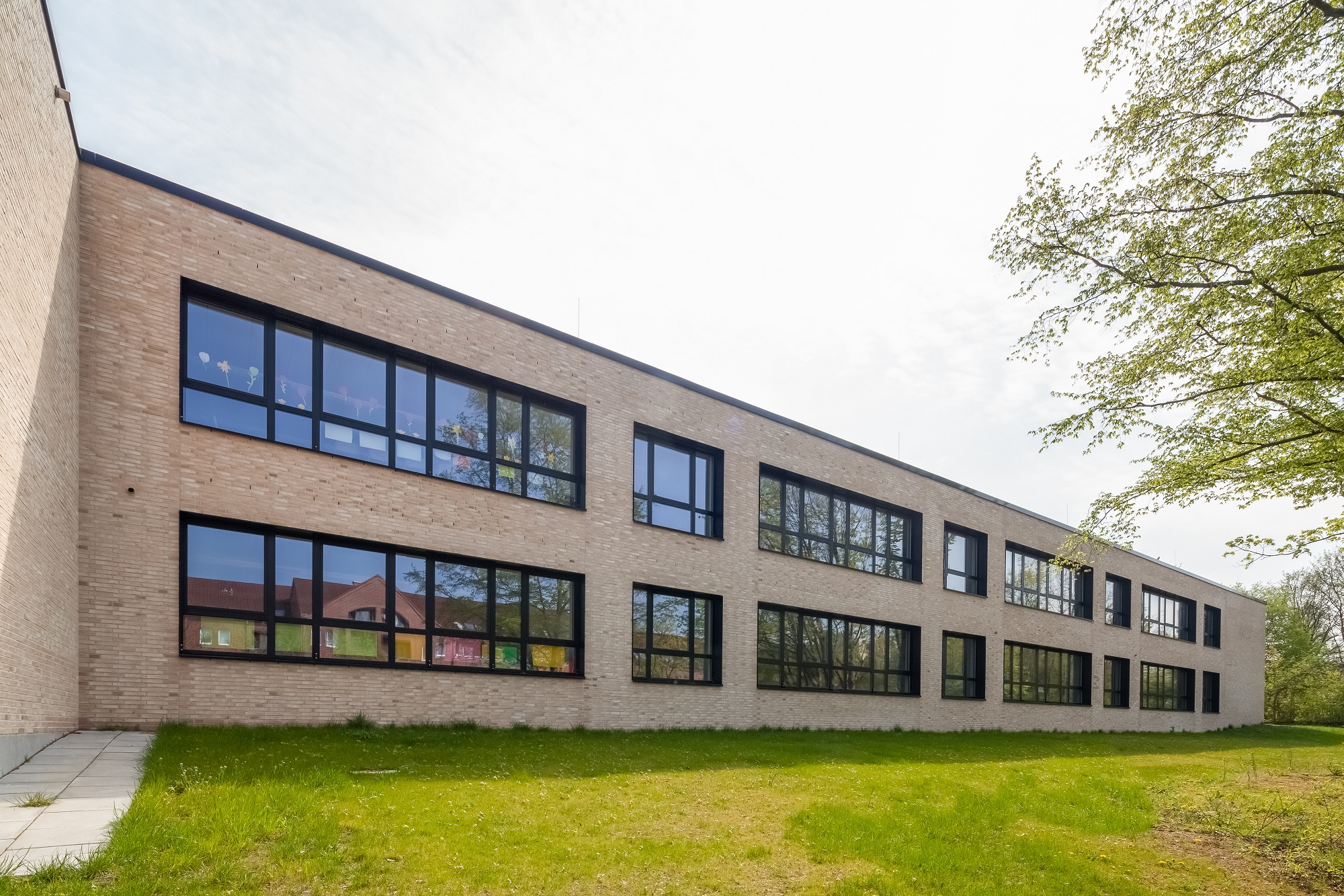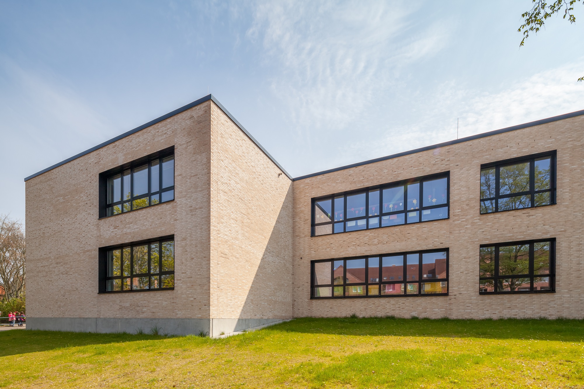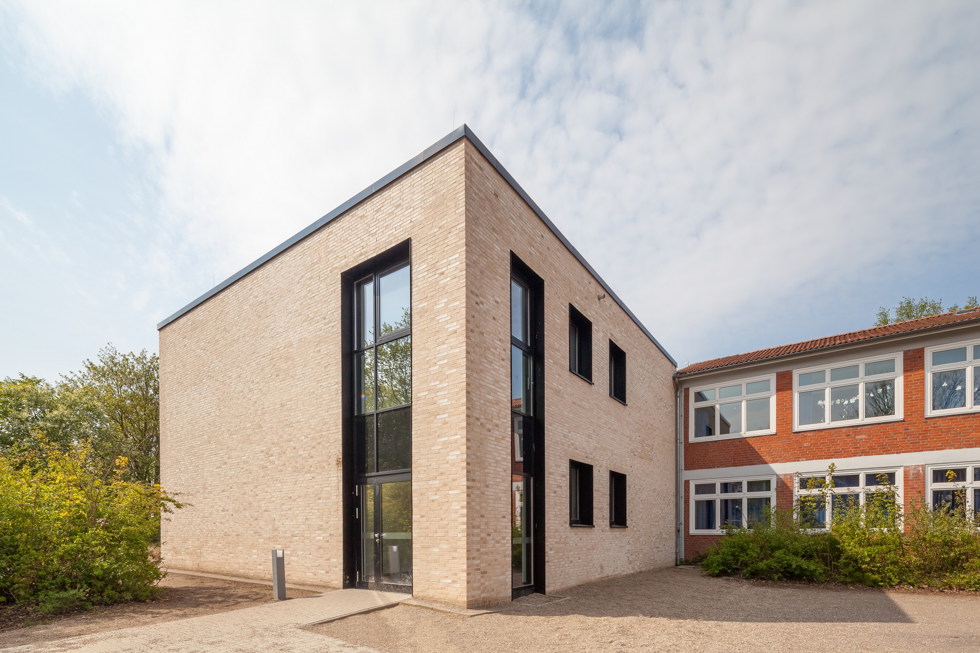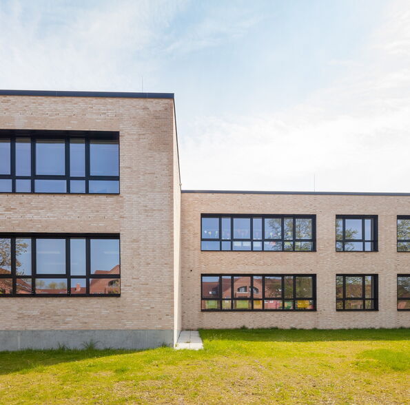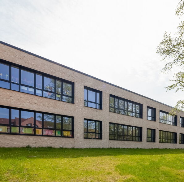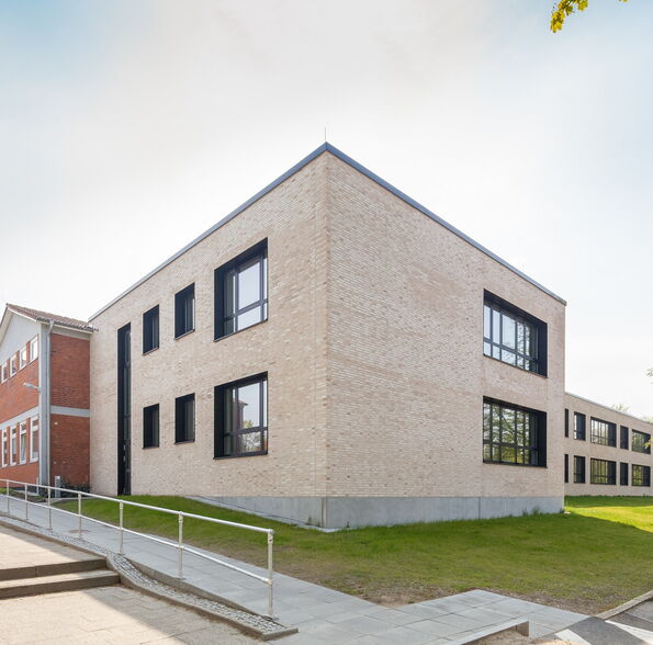 Die Bestandsschule ist aus drei schlanken, parallelen, 2-3 geschossigen Gebäudetrakten und einem erdgeschossigen Verbindungsgang gefügt. Der Erweiterungsbau aus allgemeinen Unterrichts- und Fachunterrichtsräumen legt sich direkt an den nordwestlichen Trakt an, so dass eine funktionale Einheit entsteht. Er setzt sich jedoch in seiner Form und Gestaltung vom 1960er Jahre Bestand ab, um als Neubau ablesbar zu sein.